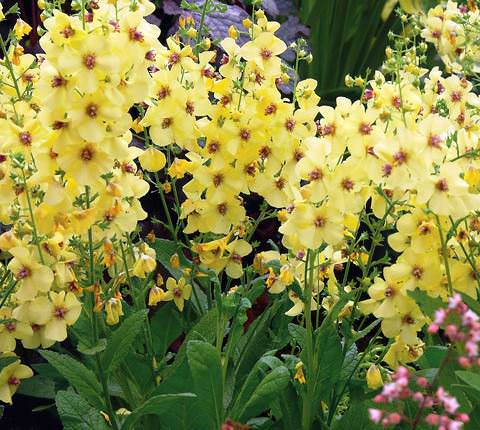 Этот вид был специально выведен для использования в декоре сада. Он отличается хорошей выносливостью, поэтому выращивается даже в условиях сибирского климата. Интересно, что коровяк гибридный дает цветки все лето, а если своевременно удалить все засохшие соцветия, он покроется цветами еще и в сентябре, правда, их будет не столь много.