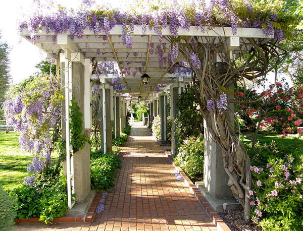 В южных регионах часто можно увидеть перголы, увитые разросшимися каскадами плетистых роз, плюща и клематисов. К сожалению, эти растения плохо переносят холода, поэтому на более северных территориях их выращивание на перекрещенных опорах бывает порой нерационально: побеги клематиса и королевы цветов так плотно обвивают перекладины, что их практически невозможно аккуратно отделить и укрыть на зиму.