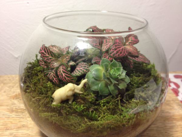 - Флорариумом могут послужить бутылки, крупные бокалы, небольшие аквариумы. При использовании этого способа в субстрат нужно добавить керамзит или кокосовое волокно. Несомненно, данный метод выигрывает по сравнению с горшком, поскольку «бутылочный сад» — это закрытая экосистема, в которой влажность и температура всегда поддерживаются на одном уровне за счёт образования конденсата. Единственный минус флорариума — непригодность для выращивания крупных растений.